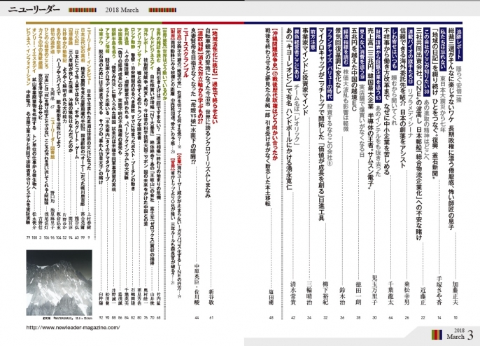 今年秋の自民党総裁選、安倍晋三首相の3選が有力視されますが、そんなに楽ではなさそうです。石破茂元幹事長と小泉進次郎筆頭副幹事長が連合を組めば大きな脅威になります。それよりも何よりも安倍政権に対する倦厭感が何より大きなハードルになりそうです。東日本大震災から7年、地域の日記を綴り続ける「復興 釜石新聞」の奮闘をレポートしました。企業研究は「三菱の源流」日本郵船に襲う荒波を検証しました。また、ベテランが結集し創薬をアシストするリブラメディシーナ、あのインテルをも抜き去ったサムスン電子、ニッチトップの日進工具を取り上げました。大企業の不祥事や働き方改革に苛まれる中小企業の現場も追いました。世界の雑誌を読むでは「適温相場の終わりの始まり」を検証しました。その他、自慢の連載もご堪能ください。