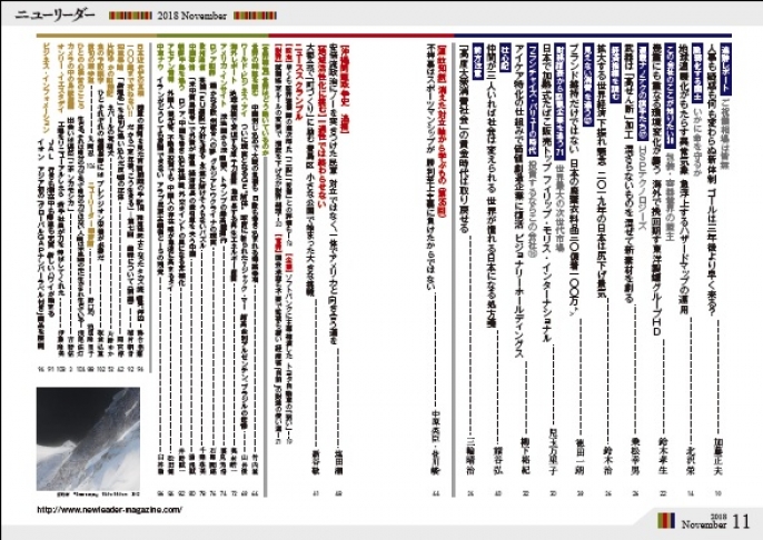自民党総裁選を制し、史上最長政権の権利を手中に収めた安倍晋三首相ですが、人事も疑惑も何も変わらぬ新体制は、一強神話が自民党内部から揺れ始めている証左です。追跡レポートが鋭く迫ります。そして、沖縄問題も安倍政権の強引さが目立ちます。また、国土強靭化といいながら、せっかくのハザードマップが生かされていません。特別レポートで新たな動きを紹介します。企業研究は東洋製罐グループHD、ナノテクの旗手はHSPテクノロジーズ、財務分析はフィリップ・モリス・インターナショナル、投資銘柄研究はかつてのメガネスーパー(現ビジョナリーホールディングス)を採り上げました。米中経済戦争の余波は2019年の世界経済に暗い影を投げかけています。ITやAIなど新興産業は雇用を多く生まず、富の集中化をもたらしています。賃金を引き上げ、高度大衆消費社会を復活する手段はないものか、コラム「前方注意」はお奨めです。