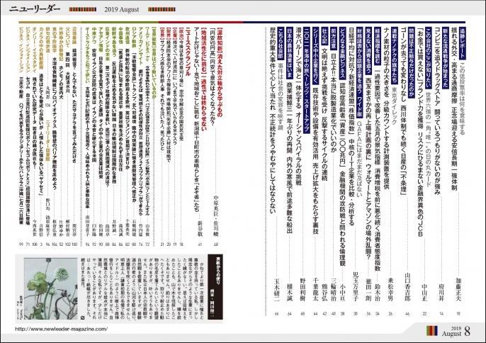 令和初の「政治決戦」参院選は与党が過半数を超え、勝利しました。しかし、投票率は50%割れ、これが国民の政治に対する評価です。史上最長を射程に入れる安倍政権の正念場をお伝えします。産業ではコンビニ業界を猛追するドラッグストアの実態を追いました。ドラッグストアには競争しているつもりはないようです。企業研究は非上場の隠れた優良会社・金融界の異端児JCBを採り上げました。また、日経平均に対抗する新経連株価指数の中核企業を分析しました。さらに、西友、日立、日産の今を各コラムが斬り込みます。「ナノテクの旗手」は東京ダイレック、スタートアップ企業はオーシャンスパイラルを紹介します。地域活性化に挑む新潟県十日市、円安で経済は良くなるのか等連載もお楽しみください。そして世界総覧は欧米・中国・アジア・中東・豪州で起きているホットな問題を解説します。